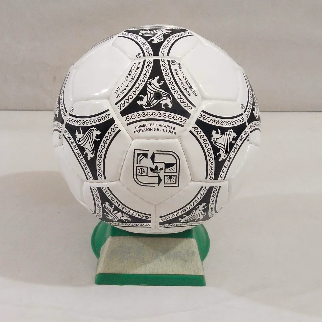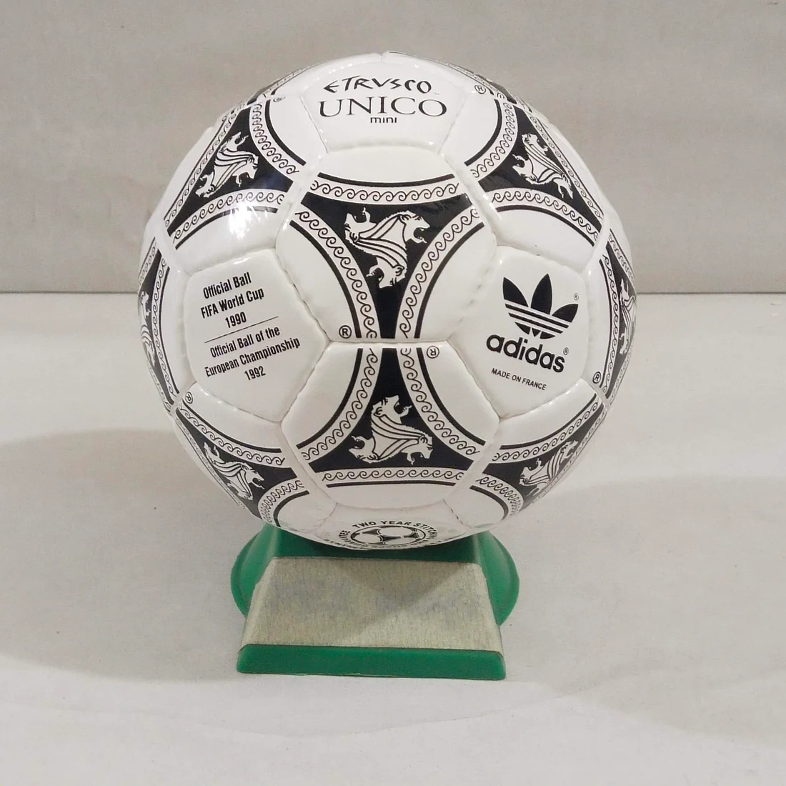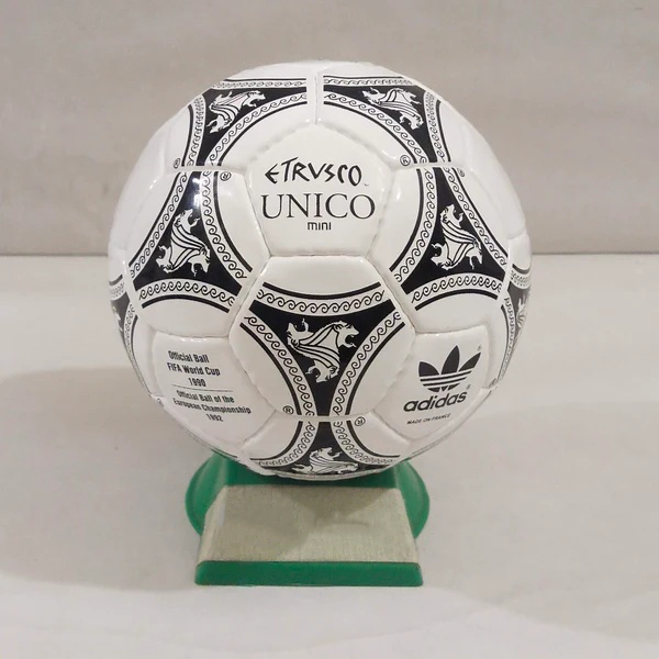 The Adidas Etrusco Unico was the official match ball of the 1990 FIFA World Cup in Italy. It had a design inspired by the ancient Etruscan art and culture of Italy, featuring 20 Tango triads with three lion heads each. It was the first ball with an internal layer of black polyurethane foam, which improved its water resistance and durability