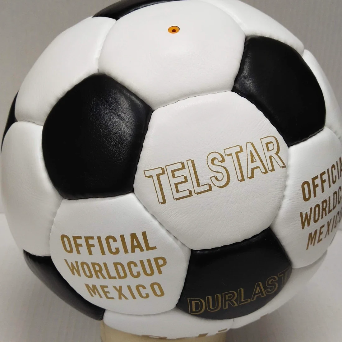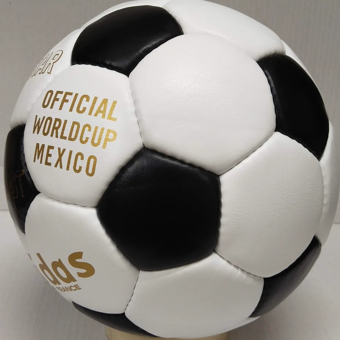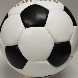 The Adidas Telstar was the official match ball of the 1970 FIFA World Cup in Mexico. It was the first World Cup ball to use the now-familiar truncated icosahedron for its design, consisting of 12 black pentagonal and 20 white hexagonal panels. The name came from the Telstar communications satellite, which was launched in 1962 and was the first to transmit live television signals across the Atlantic. The ball was designed to stand out on black-and-white TV broadcasts, which were still common at that time. The ball was made of leather and had a polyurethane coating that improved its water resistance and durability.