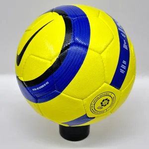 The Nike Total 90 Aerow 1 ball was used in the La Liga from 2004 to 2006. It is the successor of the Nike Geo Merlin Vapor, which is the first ball to feature the Nike Geo technology. The Nike Total 90 Aerow 1 had a 26-panel design with a textured casing that improved the ball’s aerodynamics, accuracy, and touch. The ball is made of synthetic leather with a shiny waterproof coating. The ball is named after the Total 90, a line of soccer products by Nike that aimed to enhance the performance of strikers.